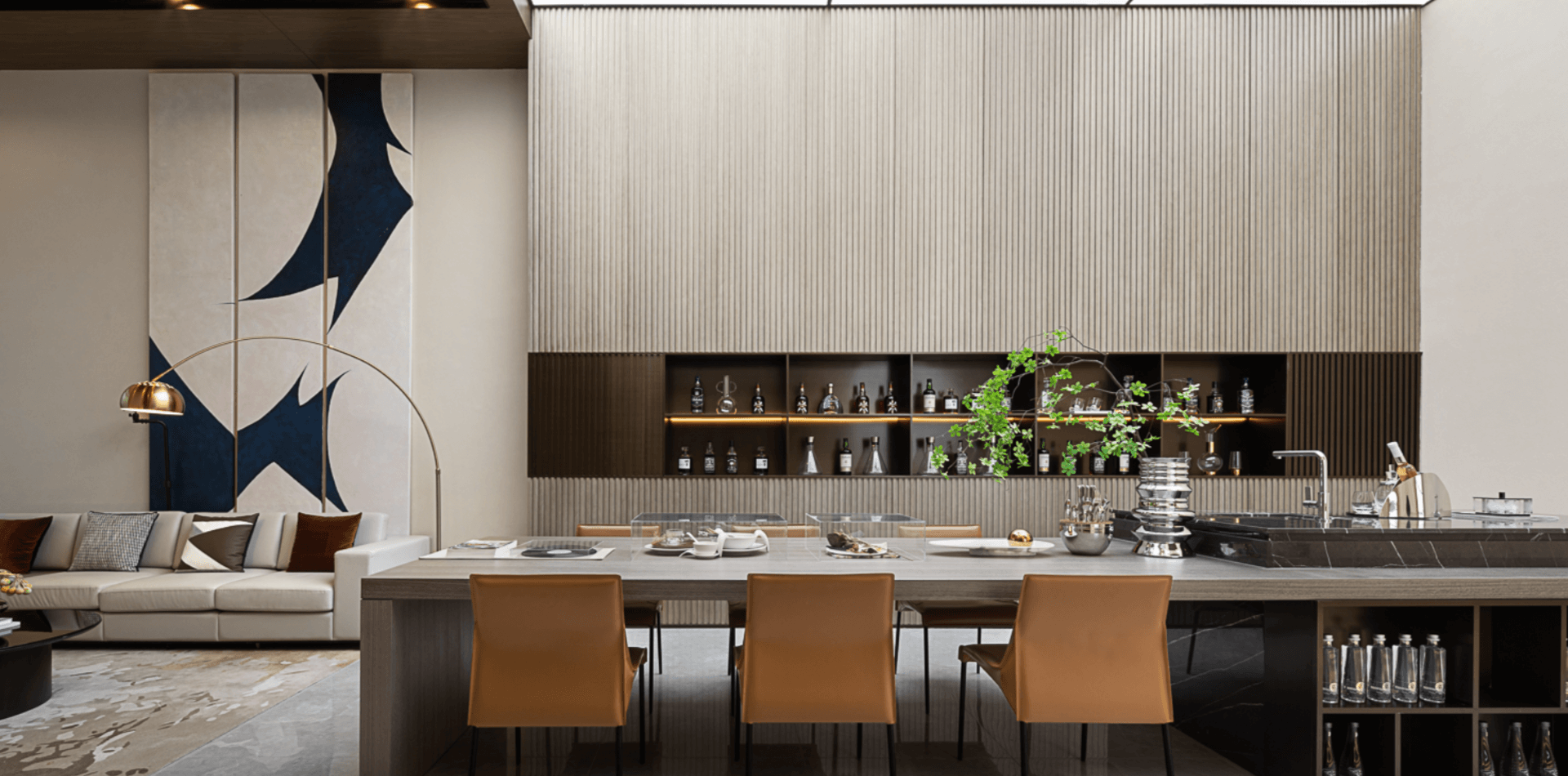 设计师以“现代、都会、沉稳”为设计主题,采用轻奢的风格谱写现代式精品豪宅。在家人的共享互动空间里,设计师有条不紊地将各个功能区域安置在不同方向,精准承担家的多元功能。同时,施以现代轻奢美学装饰,有效链接起现实与精致,让空间中每一处都散发着浓郁的优雅气质。沉稳的木饰与奢华的石材相结合,辅以金属展架的点缀,大大提升了整体空间的视觉美感。不仅如此,设计师巧妙地运用了明快的壁布、现代手法的灯槽形式,让光影在空间中自然流转。或轩朗的现代气质、或充满温暖的空间场域……给予业主一个简约舒适又不失轻奢的“家”。卧室作为家中的主要休息场所,人生中大概有三分之一的时间都在睡眠中度过,所以拥有一个舒适的卧室空间显得非常重要。设计师抬高整个房间的举架,营造更为阔绰的卧室空间,解决小空间的憋闷感,让休息成为一种极致的精神享受。奢华时尚织构生活舞台。叠墅最怕空间的不协调性,因此设计师用大块面手法打造下叠空间,摒弃过多的装饰性,结合天然的楼梯体块将空间从上到下延展开来,让地下室空间在视觉上更加和谐,目之所及,有序且明亮。