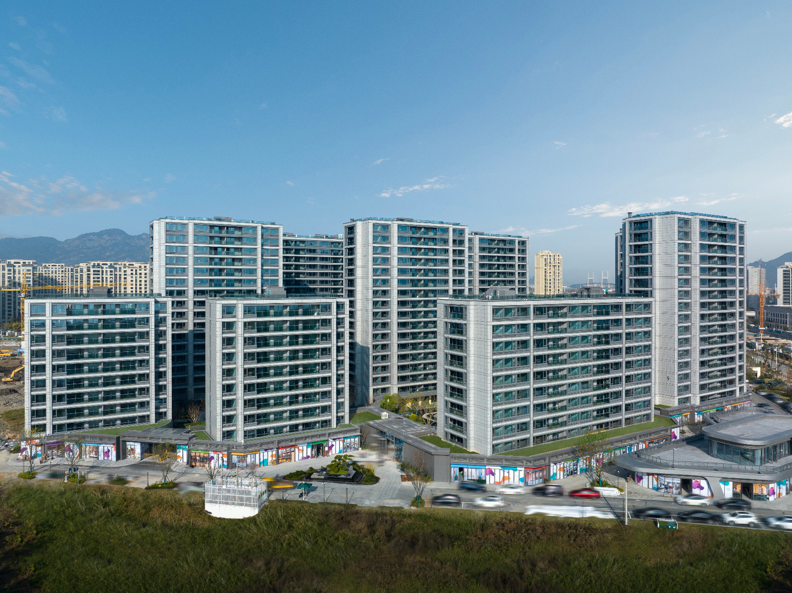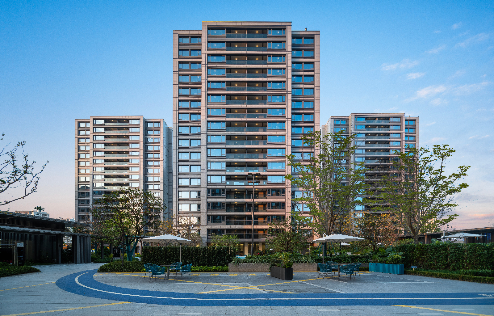 项目外立面甄选浅色石材、灰蓝色玻璃以及接近玻璃颜色的保温一体铝板,整体呈现浅灰色调,赋予了建筑时尚的韵味。 石材与玻璃构筑品质格调生活,看似单纯的色彩,却能带来视觉上的平衡,同时也能带来精神上的舒缓和平静。以最简练的形式,表达四季灵感与高级审美,与温州时代的江澜共糅合。将窗面与保温一体铝板的凹差降到极低,使建筑整体看起来就像一个平面,以“简约轻薄”的立面设计,弱化建筑带来的视觉压迫感,使得立面轻盈、自然清新。