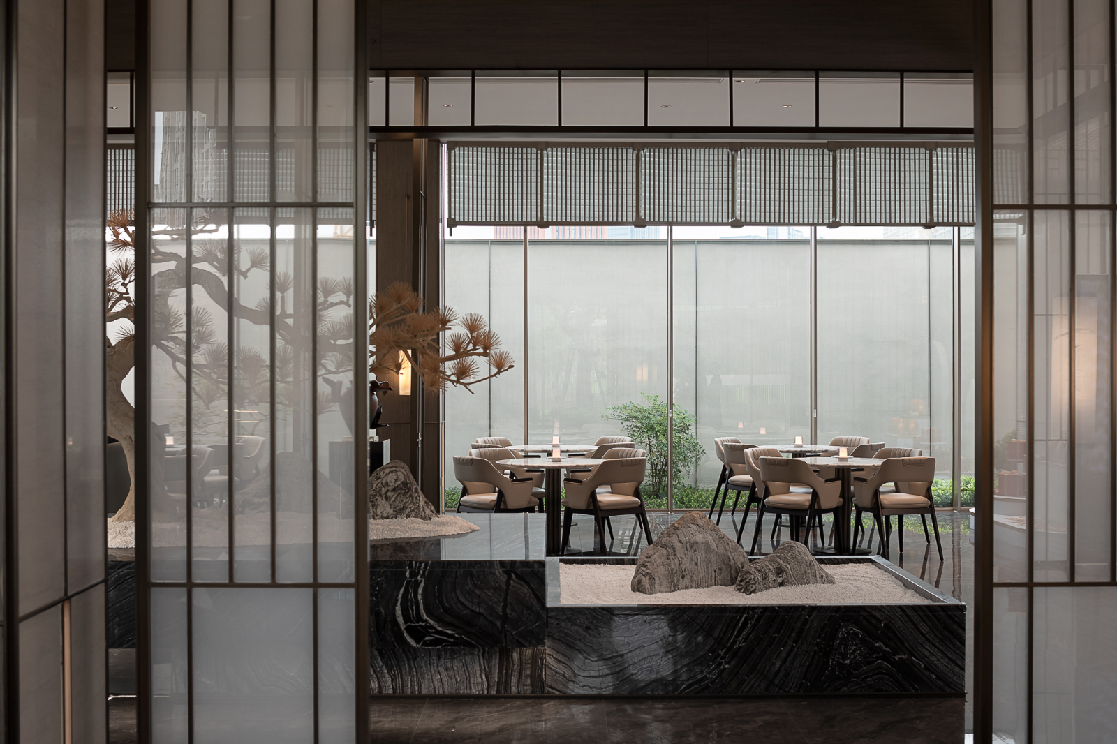 项目获2023法国双面神GPDP AWARD国际设计大奖“设计创新奖”,融合宋代美学灵感,与当代对话,以宋代文化为底蕴,打磨现代空间,呈现充满意境的东方精神的“风雅”会所空间。小隐于野大隐于市,前厅端景采用偏位的手法,松树山石,特意追求把自然美与人工美学融为一体的意境。顶面轮廓汲取宋代建筑屋檐灵感,地面由一条条石材铺设而成,如一幅幅徐徐展开的传世卷轴,让历史的诉说清晰可感。清幽画境,光影朦胧,空间营造灵动之感,承袭宋式素雅的极简气韵,将壮观繁复的景色收入空间之中。在这繁华都市中,宋韵的设计如一曲古老的旋律,唤醒沉睡的历史情感,以极简线条勾勒岁月的痕迹,以精妙设计赋予空间美的生命力,让千年宋韵的美学礼制,缓缓流淌于空间的每一个角落。
