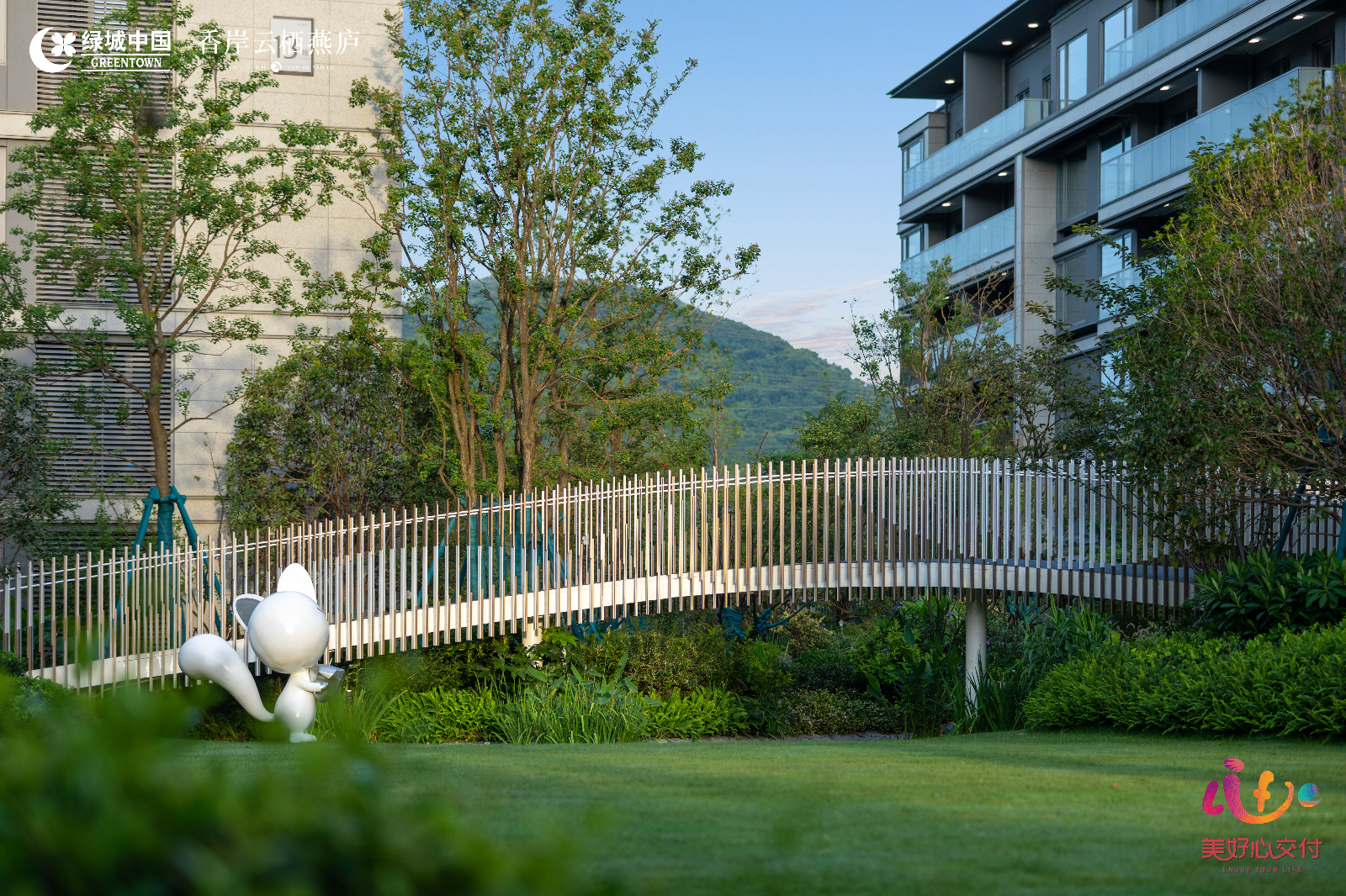 烟柳画桥,风帘翠幕。这诗画般的一幕在杭州云栖燕庐便可寻得,未见如烟的柳树,却以一座长约28米的彩绘异形景观桥连接起生活与诗意,桥下为鹅卵石铺装的旱溪,周边铺设大面草坪,整体营造一处绿意盎然、充满野趣感的自然公园。景观桥采用曲线造型,两侧山纹点题“九曲探梅峰”,成为园区专属的文化印记。为最大程度还原设计效果,每一根栏杆均是定制加工而成。运至现场后,园林古建团队则按照不同编号及颜色,将栏杆分段放样,“2片咖啡色+1片白色”为一组拼装为一根栏杆,最终468根栏杆历时4天组装完成。桥面材质也是“考验重重”,经透水混凝土、胶粘石等多种材质比选,并综合考量品质感、防滑度、耐久性等多方因素,团队最终选用了塑胶材质,接触面“柔软”,且安全系数高。行走在园区中,还能发现很多“新”朋友。据悉,在景观铺装中,园林古建团队应用了十余种铺装材料,以应用于不同的场景中。PC砖切割的弧形板、位于口袋花园的防腐木、儿童活动区的彩色塑胶、旱溪区域的花岗岩、鹅卵石,以及铺装于不同园路的芝麻黑、芝麻灰、雪浪白……赋予园区更多样的生命力。